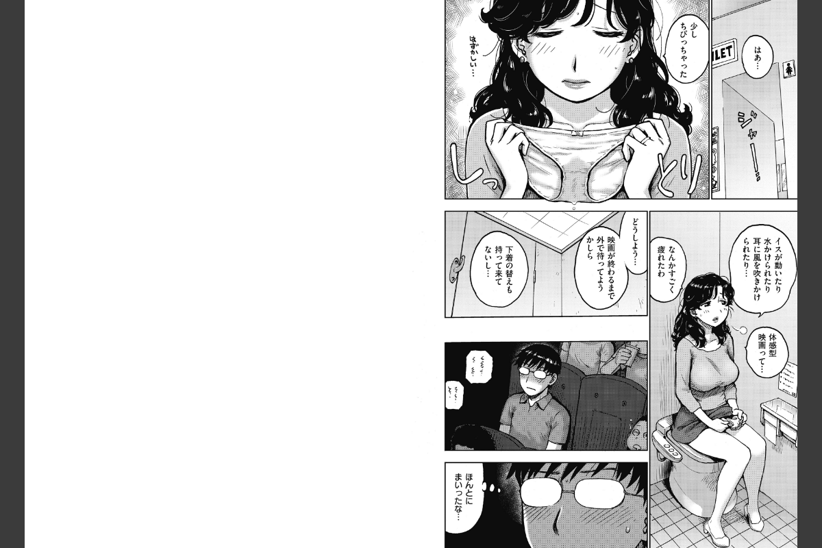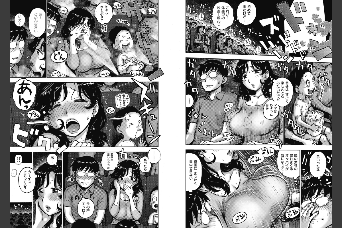 息子と一緒に初めての体感型の映画館!! でも激しい揺れ少しちびってしまい、トイレでパンツを脱いでノーパンになってしまった人妻。そんな彼女の隣の席には、人妻の揺れまくる巨乳に反応してズボンを突き抜けてしまった勃起チ●ポを収めようと必死な青年。トイレから席へ戻った人妻がハプニングで青年の上に!! 止まらぬ激しい座席の揺れに、気づいたら――挿入(はい)ってる!?