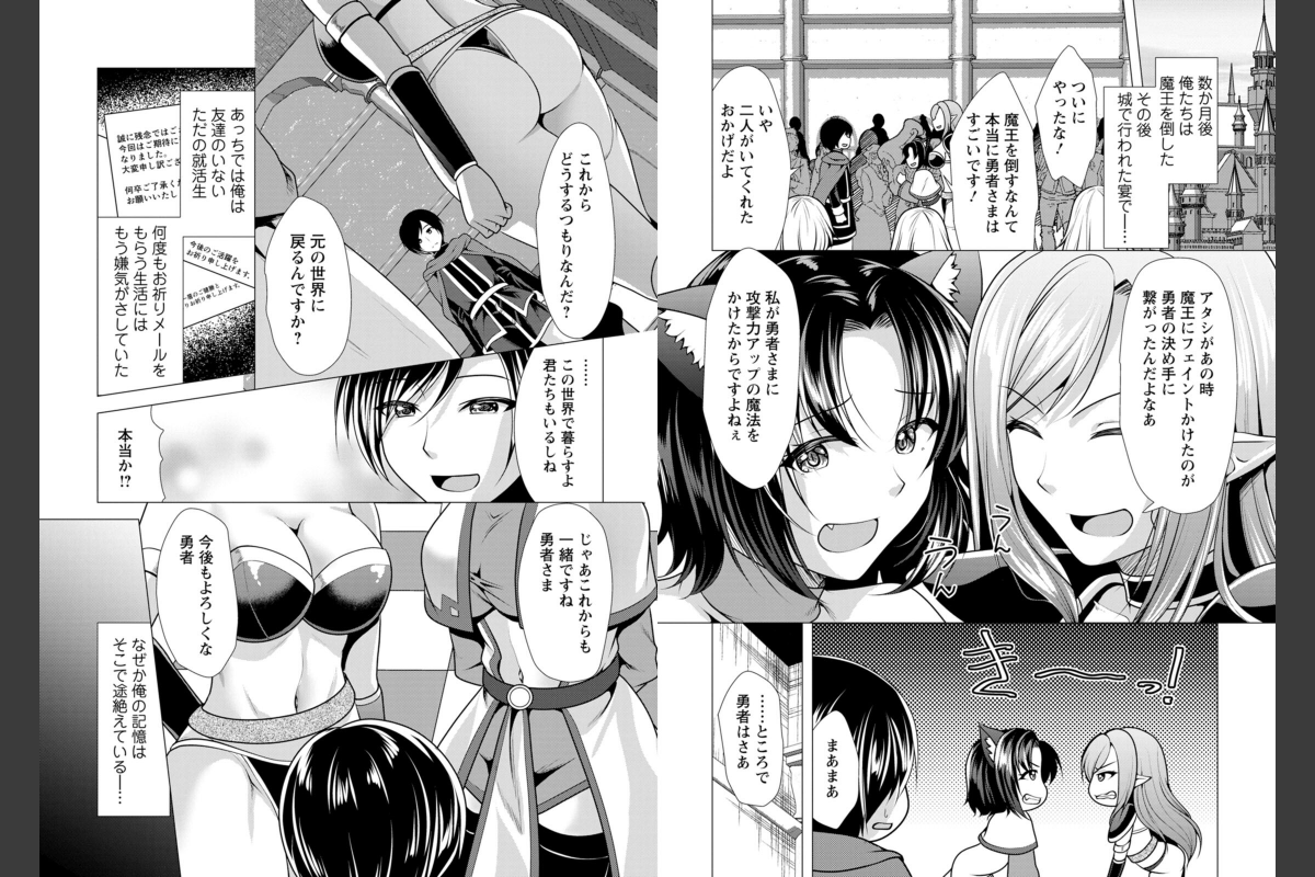 異世界に召喚され、苦難の末に魔王を倒した勇者・天沢陸は、目覚めると現実世界へ戻っていた。なぜかパーティメンバーの戦士・エレと僧侶・ミーシャまでついてきてしまっており、目覚めたとたん急激に性欲が高まった3人は、疼く身体の欲するままにSEXしてしまう。 向こうの世界に帰る方法も分からず、しばらくは日本で暮らす覚悟を決めた彼らだったが、こちらでの陸は職もなく友人もいないただの凡人。皆の食費を稼ごうと、まずはバイトの量を増やすのだが…。3人でのハーレム生活を守るため、異世界勇者の新たなる闘いが始まった!!