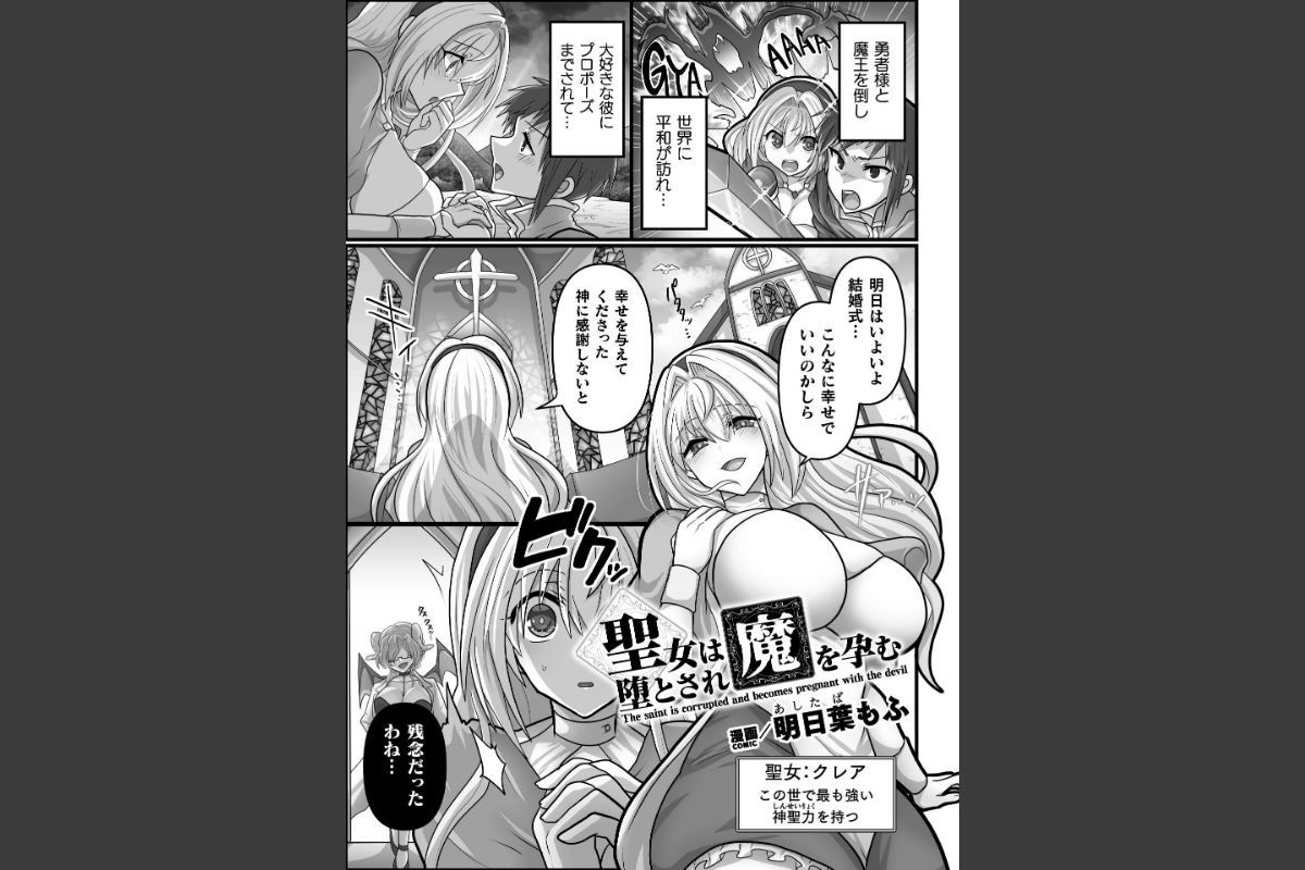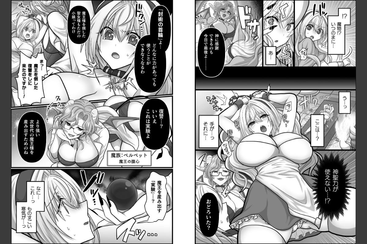 勇者と共に魔王を討ち倒した聖女・クレア。勇者との結婚を前にした彼女の前に現れたのは、かつて魔王に仕えていた腹心の魔物・ベルベットだった。ベルベットは、魔王を転生させるための実験を行うと告げ、クレアの胎内に【魔王の魂を封じた玉】を埋め込む。そして、より強力な魔王を誕生させるため、彼女を他の魔物たちに犯させていく……。触手、ゴブリン、スライム――多くの魔物に蹂躙されたクレアは、身体に快楽を叩き込まれつつ、魔法によって即座に妊娠と出産を繰り返すことになり……。※『二次元コミックマガジン 異種交配実験 異形を産まされる美女たちVol.1』に掲載されている作品です。