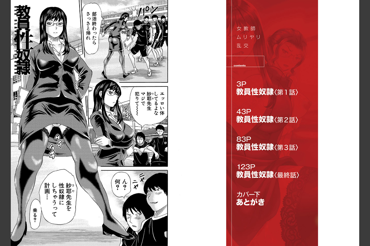 【第1話試し読み付き!!】女教師は●すのに最適だよな!女教師4人と乱パだぜ!!エロい体の女教師・紗耶先生、エロすぎるので奴●にしちゃおう!お金に困っているのにつけ込んで、1か月奴●にしちゃった◇女教師で、しかも気の強い先生と犯るのってホント、チ〇コバキバキになっちゃうよ。そんでユリカ先生も犯っちゃうように誘い込んだら、先生結婚控えてるのに処女だったんで膣内射精しちゃったよ。もっと女教師と犯っちゃおう!!【収録作品】教員性奴●〈全4話〉あとがき(カバー下)【FANZA限定特典】表紙イラストラフ案を収録!【通常特典】表紙イラスト(タイトルロゴ・トリミングなし)