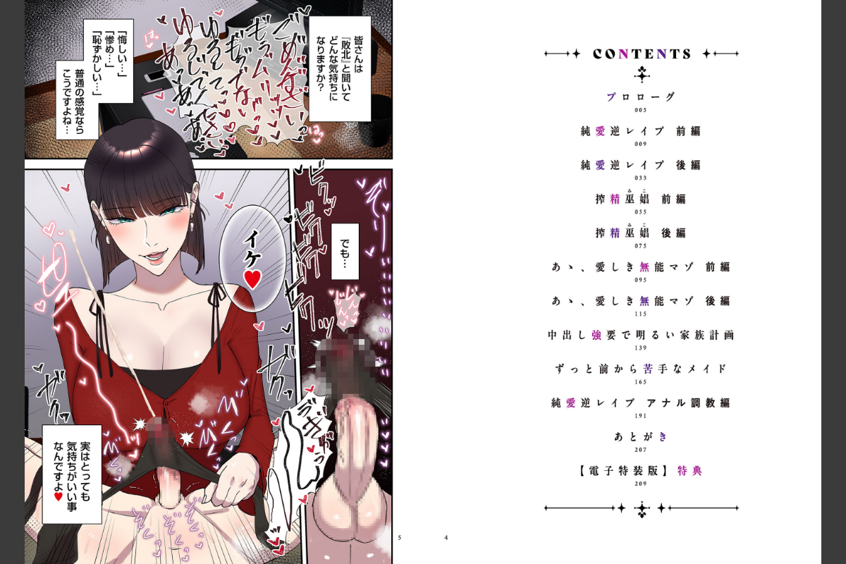 マゾが大好物なおねぇさんに屈服させられる快楽!マゾが大好物なドS女性に自らの性癖を見破られ、調教され、玩具にされる!徹底的に負け癖をつけられてしまったウブな男たちの物語――。ウェブマガジン『comicクリベロン DUMA』に掲載された、女性に屈服させられる快楽がテーマの作品集。短中編5話に加え、「純愛逆レ●プ」続編16ページを描き下ろし収録!逆転なし完全女性上位漫画で熱狂的なファンの支持を集める同人サークル「お口の奥地」主宰の渡薫デビュー単行本です!【電子特装版 描き下ろし漫画8ページ】カルト宗教の女教祖を描いて配信で大人気を集めた「搾精巫娼」のその後の主人公たちの話を収録!!収録作品純愛逆レ●プ 前編純愛逆レ●プ 後編搾精巫娼 前編搾精巫娼 後編あゝ、愛しき無能マゾ 前編あゝ、愛しき無能マゾ 後編中出し強要で明るい家族計画ずっと前から苦手なメイド純愛逆レ●プ アナル調教編【電子特装版】特典 搾精巫娼 特別編