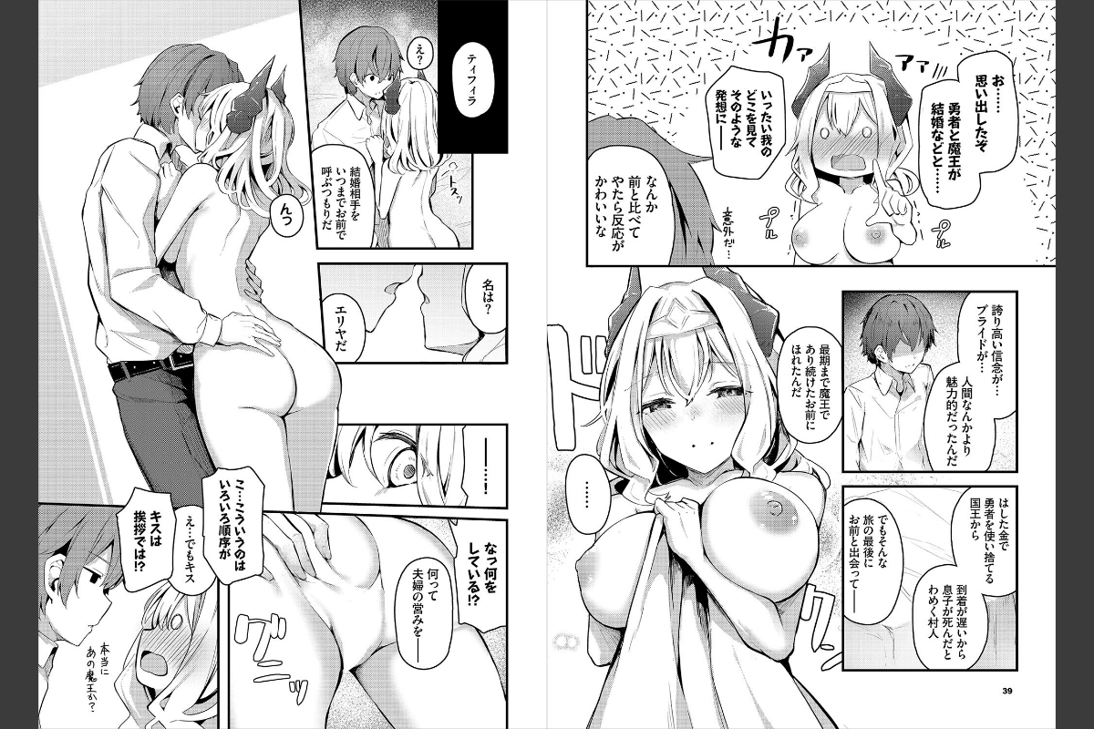 勇者に追い詰められた女魔王。観念し首を落とせと言う女魔王をよそに、勇者は急に結婚を迫ってくる。驚きつつもダメージにより気を失ってしまった女魔王。目を覚ますと、そこは勇者の家で彼は惚れた理由を説明し始めた…。 処女魔王と勇者の純愛初体験談&孕まセックス!