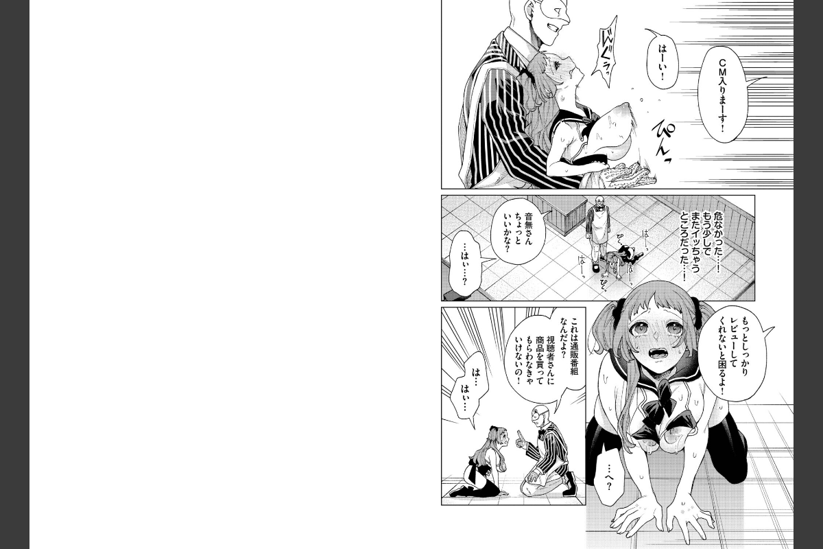 【今度は通販番組で派手にイカせていただきますっ☆】ハードコア×インモラル作家・ヒノ山田が放つ、ナマ放送でおち○ぽレビュー♪前回の性教育番組を見たプロデューサーから静子のもとに直々にオファーが…!その内容とは『せいかつ』通販番組という生放送の番組らしく、若干疑念を持ちつつも快諾することに。そして始まった生放送、そこで静子は『せいかつ』が『性活』だということに気づく!!いまさら後には引けないと腹を括った静子だが、販売士の男に好き勝手アレコレ実演されちゃって…!?果たして静子は最後まで仕事をまっとうすることができるのか…!!