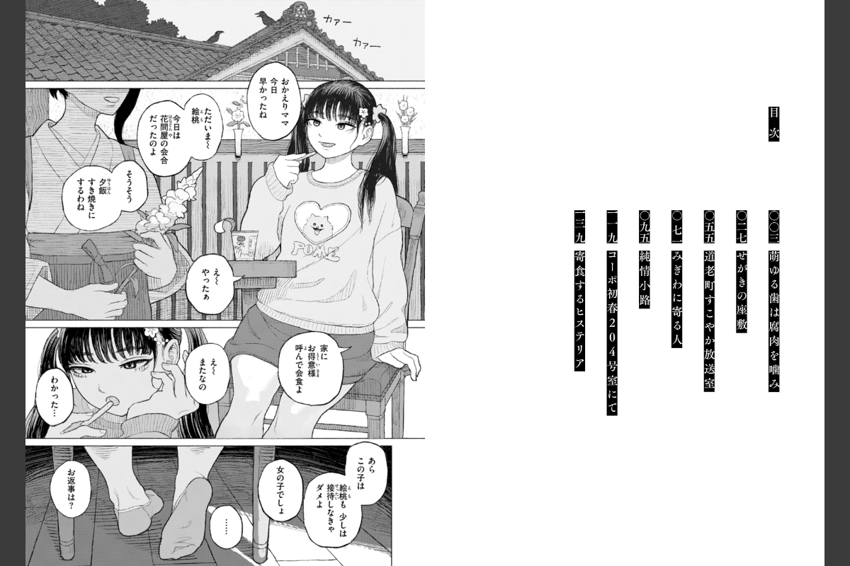 聖と俗がみだれ、清と濁がまじる。重厚なストーリーと緻密な性描写で魅せる、鬼才・なまえ れんらく 初の作品集!!「何も 考えなくていいの 私が 食べてあげる…」鬱屈した日々を送る令嬢・絵萌(えも)。間抜けで冷遇されている肉屋の雇われ男・捨造(すてぞう)。本来交わるはずのない二人が出会い、屈折した性は変態行為へと向かう──生と死のにおいが混じる肉屋の作業場で、下層の男に汚される背徳感に恍惚……。『萌ゆる歯は腐肉を噛み』をはじめ、退廃的な世界観で繰り広げられる少女たちの祈り<セックス>を描く全7編。下水道で無許可営業している謎の女の子に出会う……『せがきの座敷』久々に帰ってきた狭い村で、恋心を抱いていたおじさんと……『道老町すこやか放送室』ボロアパート一室で、奥手な男友達が寝ている間に……『コーポ初春203号室にて』<収録作品>萌ゆる歯は腐肉を噛みせがきの座敷道老町すこやか放送室みぎわに寄る人純情小路コーポ初春203号室にて寄食するヒステリア