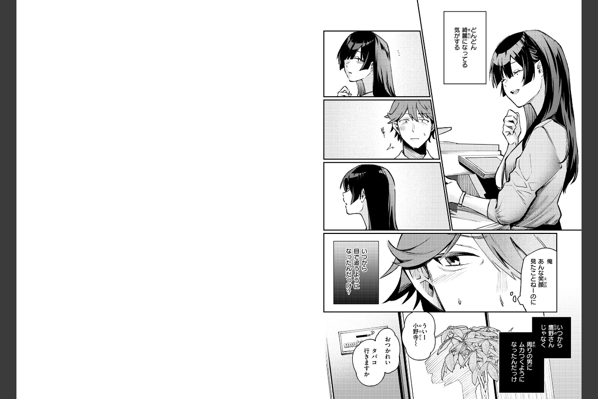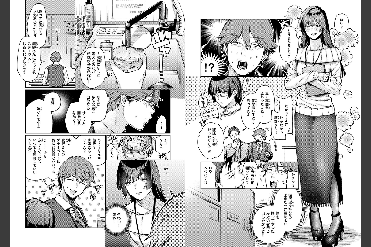 「したかったのはそっちでしょ?」会社で一番地味な女・鷹野(たかの)さんに振られた。はっきり言って女に困ったことないし、単純にヤれそうだったから声をかけたのに調子のんなっての。もやもやしながら出勤すると、以前の地味メガネの愛想のなかった姿からは想像できないほど雰囲気が変わった鷹野さんが。どんどん綺麗になっていくし、ばかみたいに分かりやすく惹かれていく周りの男にムカつくし……俺が最初にあいつが可愛いって気付いたのに。よかったらご飯だけでも…って誘ったら普通にホテルにはついてきてくれて……ほら、会わないとか言ってきたのに本当はしたかったんじゃん――?