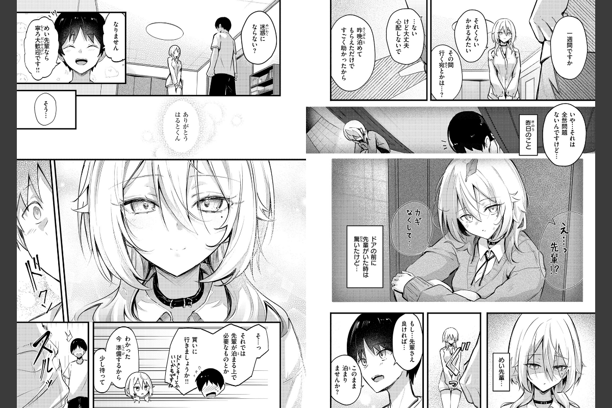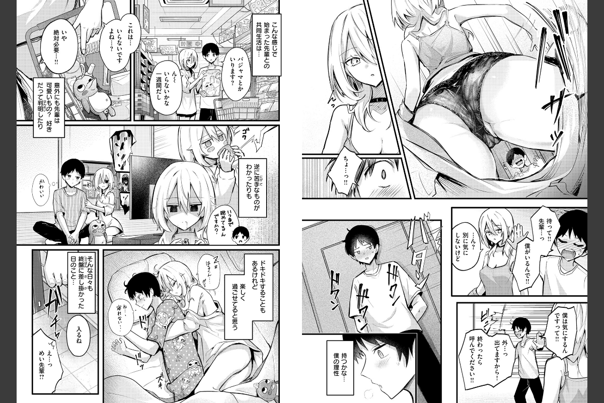「私としたい…とか思うの?」隣に住むめい先輩が鍵をなくしたらしく、僕の家に一週間泊まることになった。目の前で着替えられたり、密着して寝てきたり……無自覚に隙だらけな先輩に正直理性との戦いでドキドキすることは多いけど、楽しく過ごせてはいると思う。そんなある日、お礼がしたいからと言って先輩がお風呂に入ってきた。洗うといってち○こをいじられ、我慢できずに射精してしまうと――