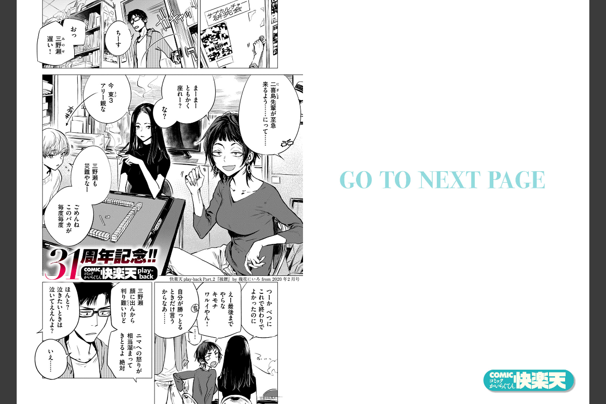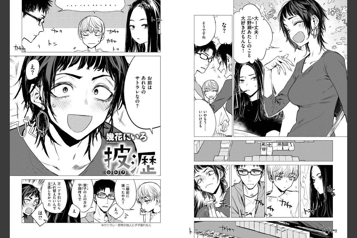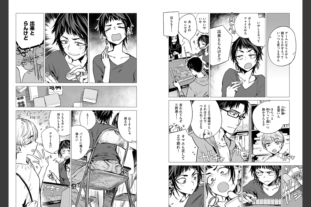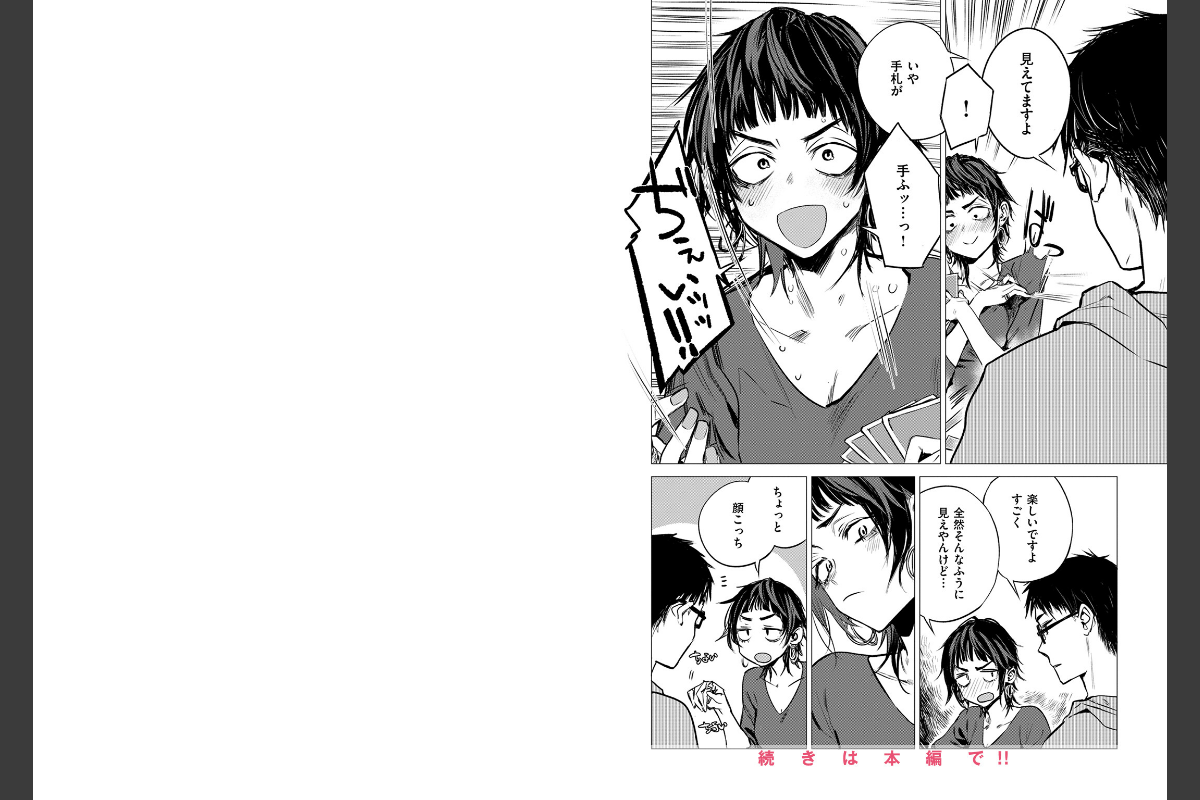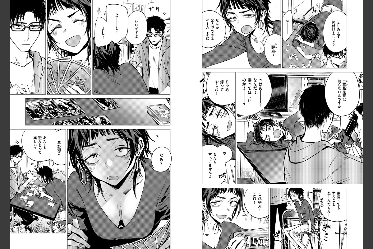 ウザい先輩がオンナに変わる瞬間――サークルの先輩・二喜島(にぎしま)に麻雀の数合わせで呼び出された三野瀬(みのせ)。顔に全部出てしまいゲームにならないと突っ込まれる二喜島に対して、終始ポーカーフェイスを貫いている三野瀬は足して2で割ったらなんていじられたり……。時間が進み、サークルメンバーが帰路につくなか、2人きりの部室。ズボラな二喜島の胸元が見えていると三野瀬に指摘されるが、それでも表情が変わらない三野瀬を動揺させてやろうと服をたくし上げてブラを見せてきて――