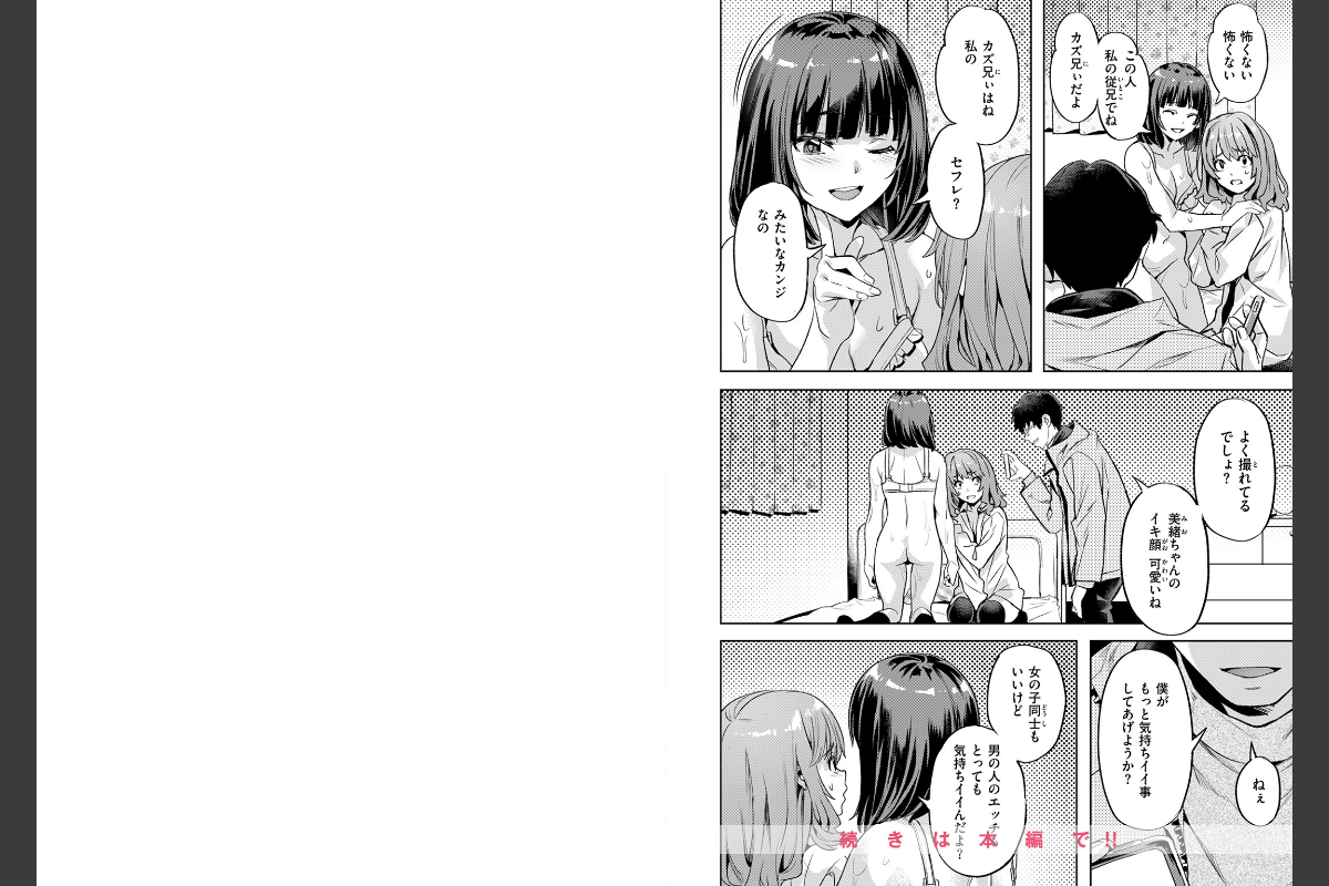 「女のコ同士もいいけど 男の人のエッチもとっても気持ちイイんだよ?」最初は恥ずかしかったし、嫌だったけど気持ちイイのが忘れられなくて――同級生の理子(りこ)に《遊び》だからといって、放課後に理子の部屋でエッチなことをされるのが習慣化してきた美緒(みお)。ある日、理子とシている最中に、知らない男の人が部屋に入ってきて、いきなり写真を撮られた。なんでもこの人は理子の従兄で《セフレ》らしく、流されるまま男の人と初SEXをすることになり……。