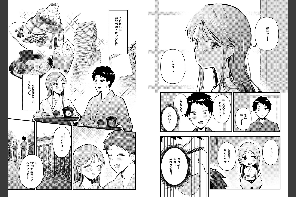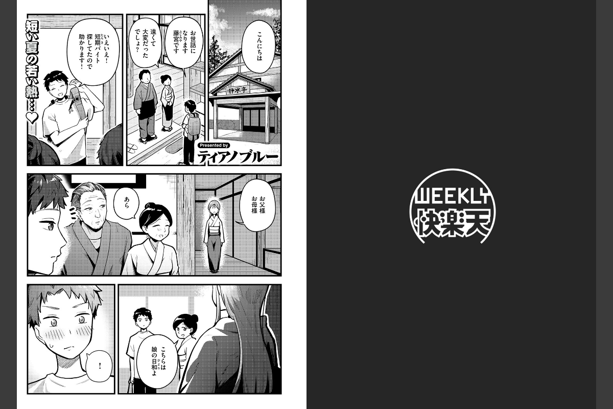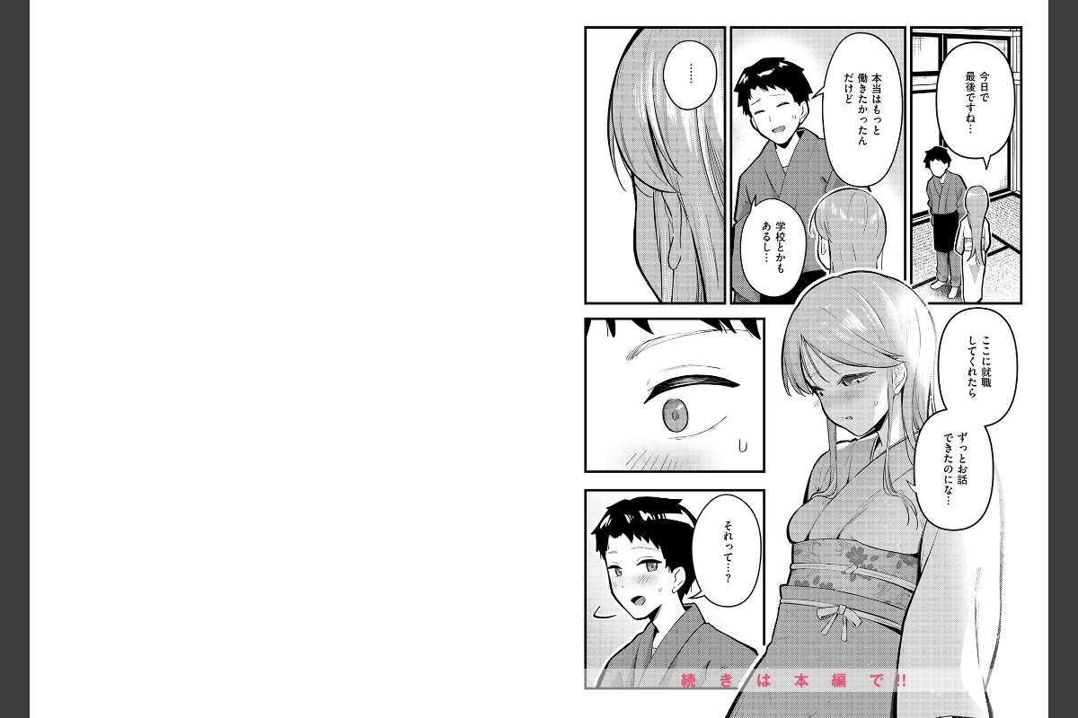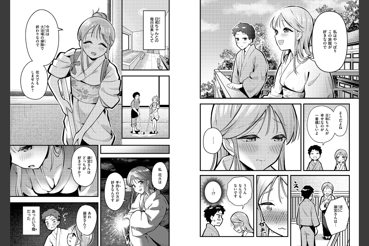 夏休みに住み込みバイトで田舎の温泉旅館にやってきた藤宮(ふじみや)は、看板娘の日和(ひより)に一目惚れ。都会の話をきっかけに打ち解けた2人だったが、バイト期間はあっという間に過ぎていき、日和との別れは近づいてくる。最終日、押し入れに隠れたふたりは思いを打ち明け合ってそのまま……。
