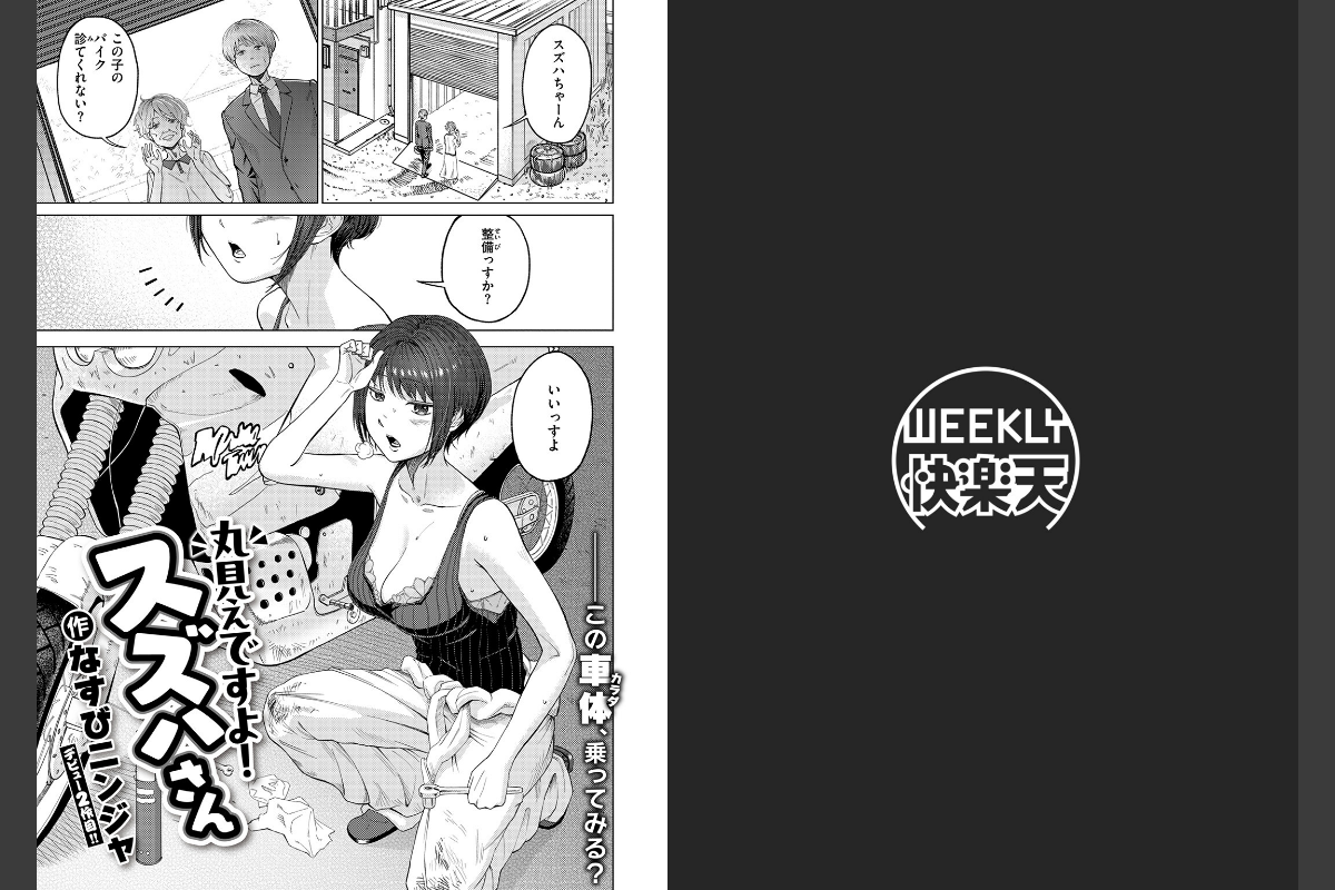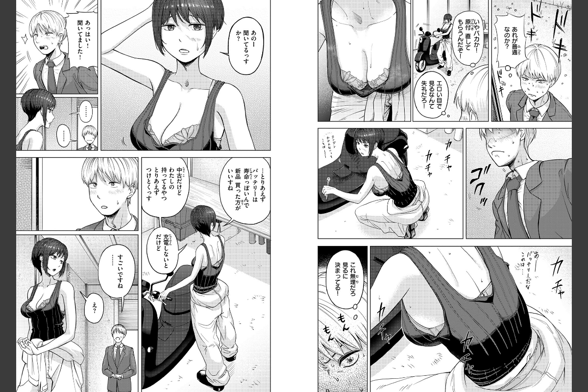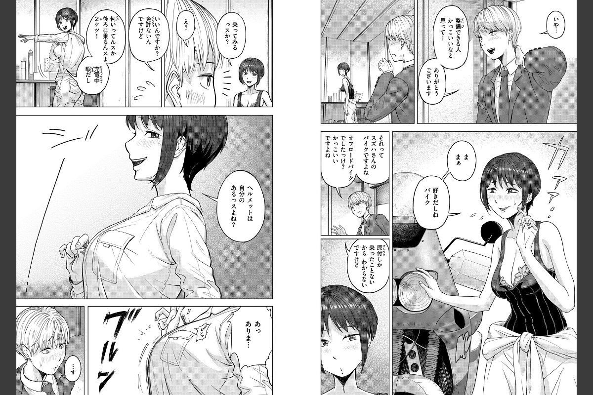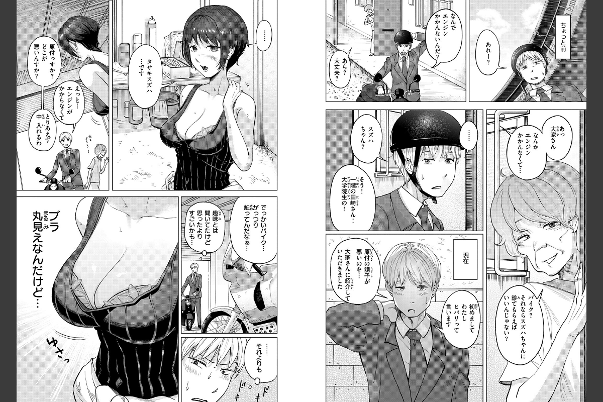 「わたし…バイク乗るとテンション上がっちゃうんすよね…」原付の調子が悪くなってしまい、大家さんの紹介で隣人のスズハさんに見てもらうことに。スズハさんは、ガチのバイクいじりを趣味にしてる大学院生で、整備してるときの姿がめちゃくちゃエロい。ブラは見えてるしなんというか全体的に乳が出ている。カッコイイ姿に見とれていたことを正直に伝えると、2ケツでドライブにいく流れに。しかし、ぶるんぶるんの胸が目の前にあって……アクシデントで少し触れてしまったあとは、歯止めが効かなくなってしまう。もちろんバレている。バレバレ。でもわかっててもマジで揉むの止まらない。もう絶対怒られると思ってビクビクしていると――