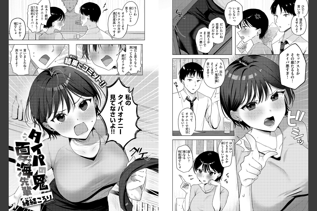 バリキャリの夏海(なつみ)先輩が大事にしているのは、短い時間で結果を出すこと。すなわち《タイパ》!!恋愛のやり取りはもちろん、果てはセックスよりオナニーの方が手っ取り早くて圧倒的にタイパがいいらしい。それを聞いた後輩くんがセックスの満足度を主張して反撃するうちにヒートアップしていく。「私のタイパオナニー見てなさいよ!」後輩くんの前でオナニーを披露することになった夏海先輩。人に見られながらのオナニーでは思うようにイけず、どんどん身体はもどかしくなってきて……。