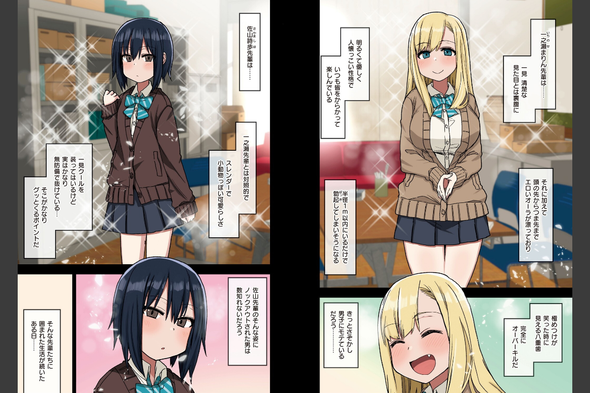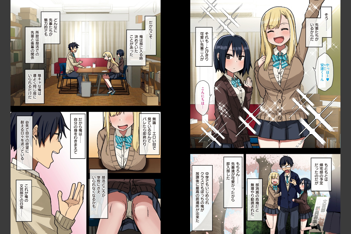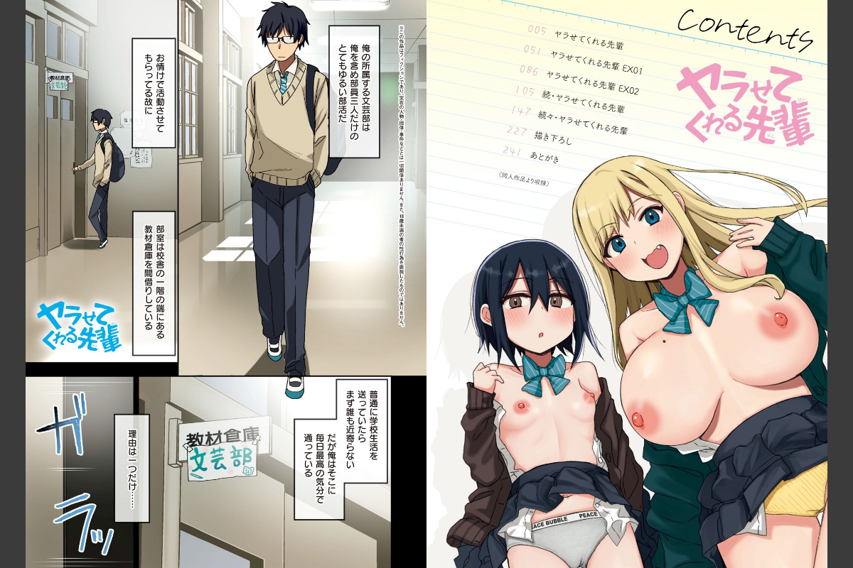 文芸部に所属する安達順一は最高の気分で学校に通っていた。なぜなら文芸部には可愛い先輩二人が待っているからだ……!!そんな可愛い先輩たちをエロい目で見ているなんてバレたら一巻の終わり。今日もスキンシップ過多な 一ノ瀬まりん先輩の接触に勃起したのを隠しなんとか耐えたが……小柄で小動物的な 佐山詩歩先輩にバレていた……まりんに勃起していた事実に対し自分には魅力がないなどと勘違いしている佐山先輩に安達は、「俺……ぶっちゃけ佐山先輩をオカズにシコってますよ」と勢い余って言ってしまう。そんな一言で佐山先輩はーー!?FANZA同人にてシリーズ累計35万DL超えの大人気作品が待望の単行本化!!人類史上サイコーのハメまくり文芸部性活が今始まる…!!![収録作品]■ヤラせてくれる先輩 ■ヤラせてくれる先輩EX01(同人版総集編描き下ろし)■ヤラせてくれる先輩EX02(同人版総集編描き下ろし)■続・ヤラせてくれる先輩■続々・ヤラせてくれる先輩■単行本描き下ろし