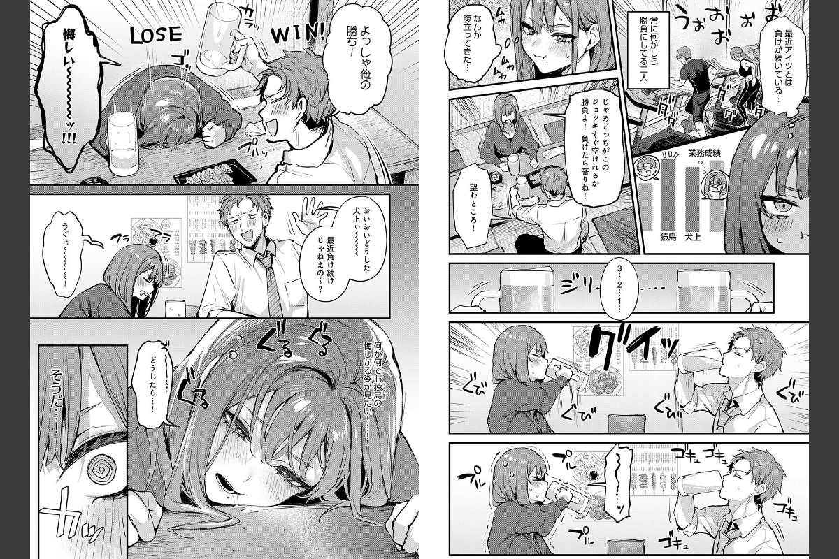 巨乳OL・犬上結奈と同僚の猿島は、喧嘩ばかりの犬猿の仲……だったが、ある夜の出来事をきっかけにお付き合い中♪恋人になった後もライバル同士の二人は、仕事でもプライベートでも、常に真剣勝負。負けが続いていた犬上は、逆転を狙い、猿島に勝負を申し込む。「セックスで勝負よ!」彼女は勝ちたい一心で、容赦ないフェラチオ・本気騎乗位で猿島の弱点を責め立てる!! 受け身ばかりではいられない猿島は、犬上にたっぷりお返しをして──!! レジェンドオブ積極女子・だにまる先生が描く、同僚カップルのイかせ・イかされセックス対決☆