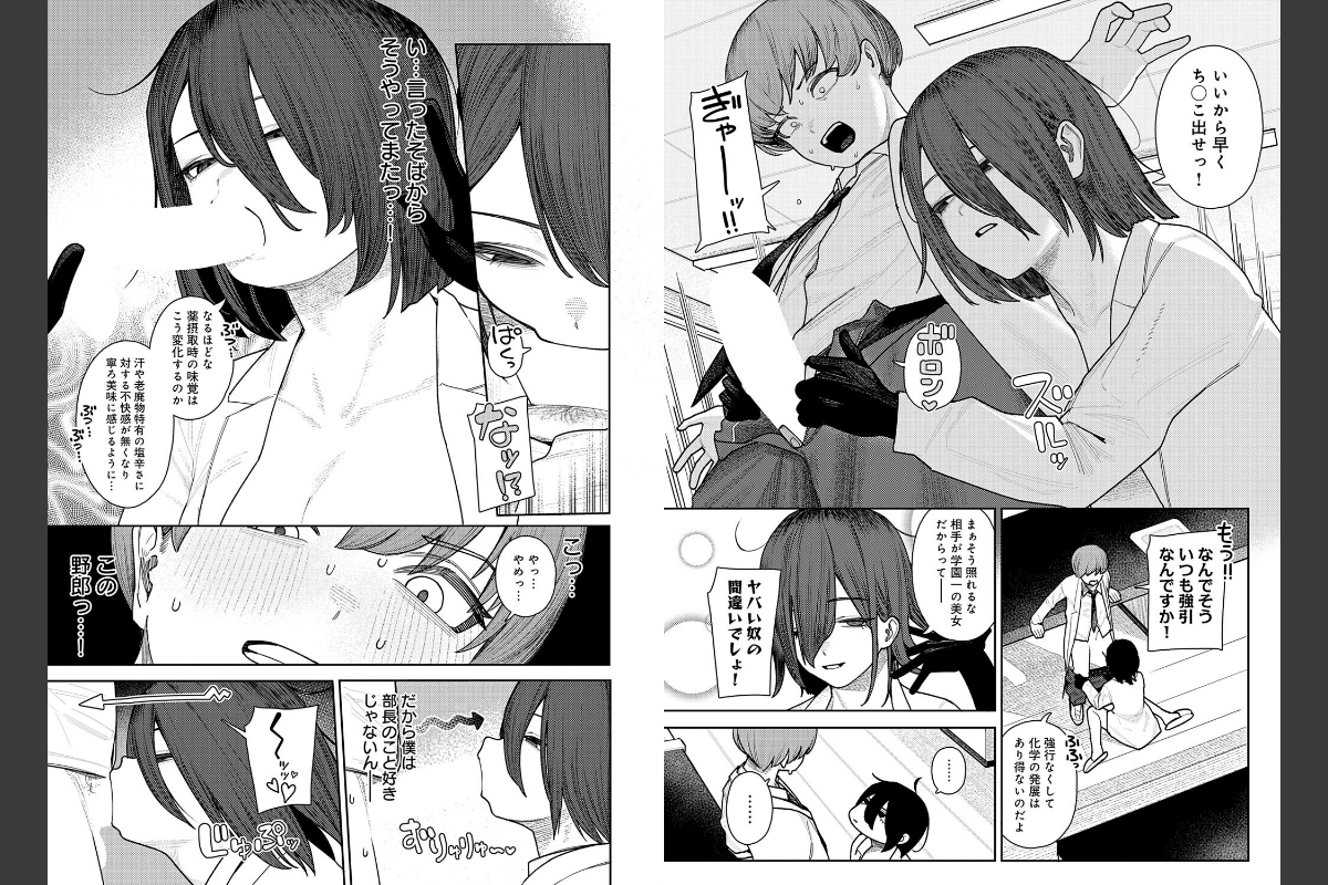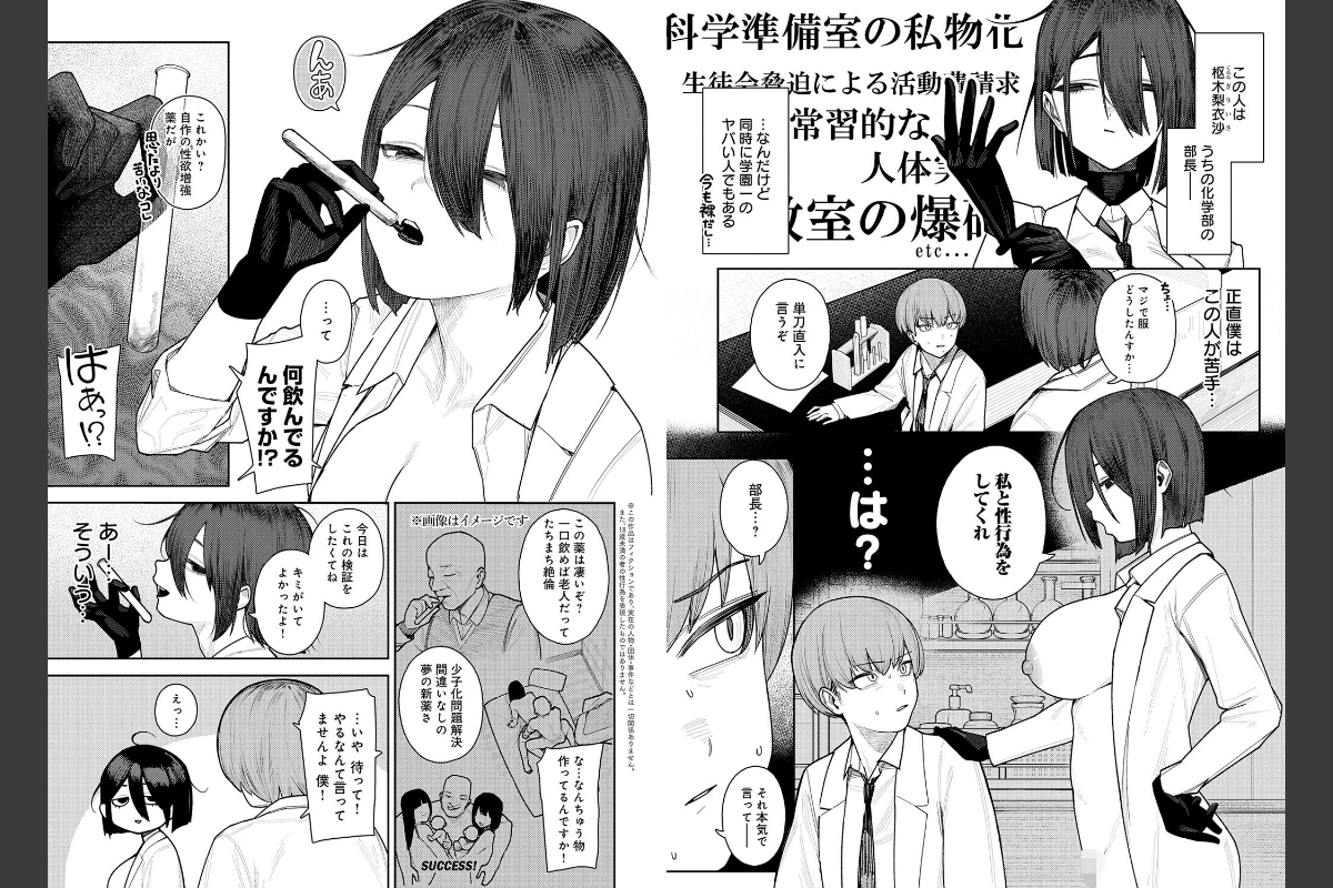 科学部部長・枢木梨衣沙は、学園一のヤバい奴。裸に白衣で声をかけてきたかと思いきや──「私と性行為をしてくれ」と言い出し!?彼女は、自作の性欲増強剤をテストしたいらしい。他に好きな子がいるという僕の言葉を無視して、ち○こを取り出して──!!もち肌クセ強女子の名手・牛蟹合戦先生が贈る、ダウナー理系女子と交配実験☆