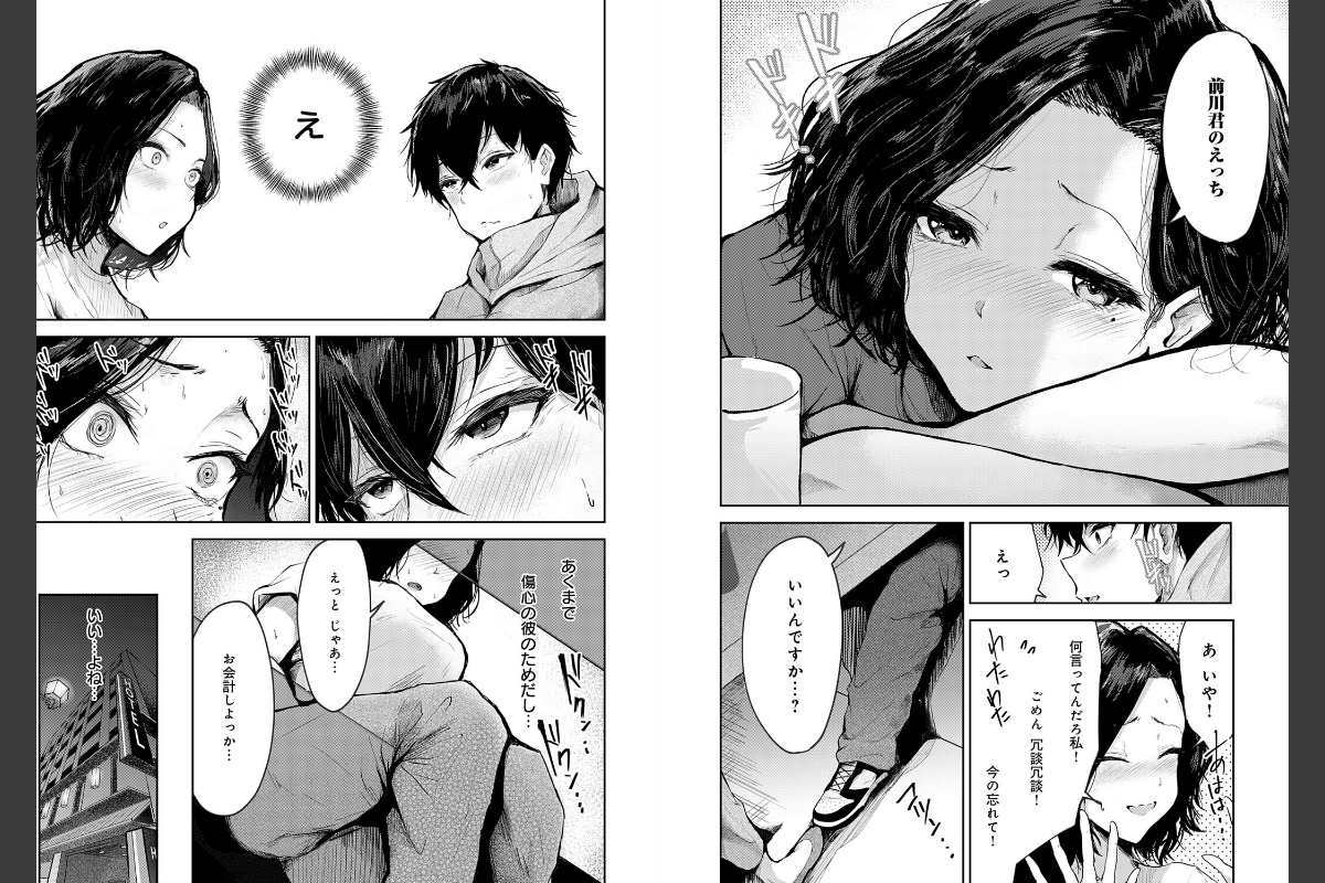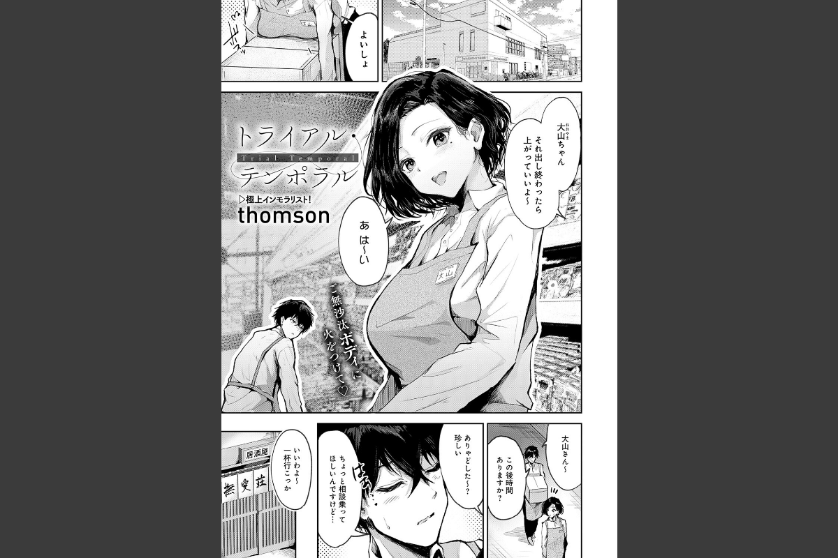 スーパーでバイトしている人妻の大山さんは、後輩男子の前川君から、悩み相談のため居酒屋に誘われる。彼女に振られ、「エッチ下手だったのかなあ…」と落ち込む前川君。しかし、大山さんには心当たりがあった。更衣室で見かけた彼の巨根。きっとエッチが下手だったのではなく、チ○コがでかすぎたのであろう、と……!彼のモノを思い返してムラついてしまった大山さんは、「私が見てあげようか? 前川君のえっち」と誘いをかけ──?恵体に自信アリ! 濃密エロスの新鋭・thomson先生が贈る、バ先の人妻と不倫FUCK!