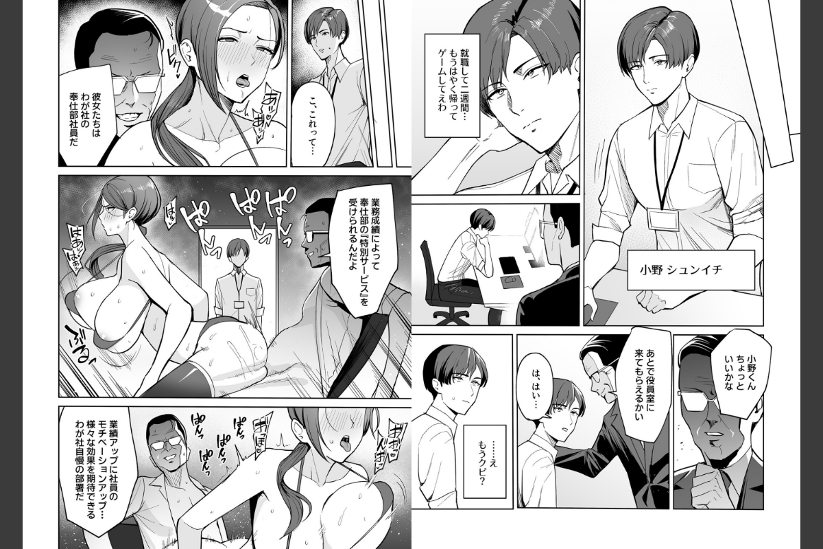 新入社員の’小野’は就職して二週間になるものの、すでに仕事へのやる気が薄れていた。そんなある日、役員室へと呼ばれた彼は信じられない光景を目の当たりにする。「こ、これって…。」薄暗い室内では重役と美しい女性社員が、生々しく身体を交じり合わせている。動揺と興奮が入り乱れる小野に対して、重役はこれ見よがしに腰を振りつつ口を開く。「これは我が社が誇る’奉仕部’の特別サービスだ」業務成績によって夢のようなご奉仕を受けられる福利厚生。その内容に戸惑いつつも小野は強く興味を惹かれ、次第に仕事にも身が入っていく。そしてとうとう彼にも奉仕部のサービスを受ける日が…『義母さんは僕のモノ』シリーズのC級先生待望の新連載開始!