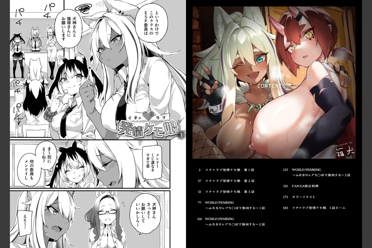 ≪FANZA限定特装版では描き下ろし漫画24ページを追加収録!!≫ふたなりケモ耳娘たちの肉欲が爆発!「ほら私がしてあげるから、おち〇ぽ出して!」半獣人の生徒が通う希繕(けも)女学園では、発情期の生徒たちの性処理を行う委員がある!?ふたなりち〇ぽが大きすぎて、見られるのが恥ずかしい生徒も我慢の限界!!犬、猫、馬、兎、虎…など、ドスケベふたなりケモ娘たちの活躍が詰まった作品が盛りだくさん!ふたなりケモ耳大好き作家・福犬の待望単行本!電子単行本では表紙カラーイラスト7ページ、イチャラブ発情ケモ娘1話のネーム24ページも収録!◇連作「WORLD PENISING〜ふたなりレアち〇ぽで無双する〜」大人気MMORPG「WORLD PENISING」では何をするのも自由自在!女アバターに男性器だって付けられちゃう神ゲー!!主人公・ヒナギクは男性器の中でもレア中のレアであるWR(ワールドレア)チ〇ポをガチャで手に入れる!そのチ〇ポでエロい目に合いながらも数々の敵を薙ぎ払っていく!!〈収録作品〉イチャラブ発情ケモ娘 1話イチャラブ発情ケモ娘 2話イチャラブ発情ケモ娘 3話WORLD PENISING〜ふたなりレアち〇ぽで無双する〜 1話WORLD PENISING〜ふたなりレアち〇ぽで無双する〜 2話WORLD PENISING〜ふたなりレアち〇ぽで無双する〜 3話FANZA限定描き下ろし特典漫画表紙カラーイラストイチャラブ発情ケモ娘 1話ネームプレステージ冬フェス2026開催!対象作品のオンラインくじ、ご新規様クーポン配布中!取得はこちら!