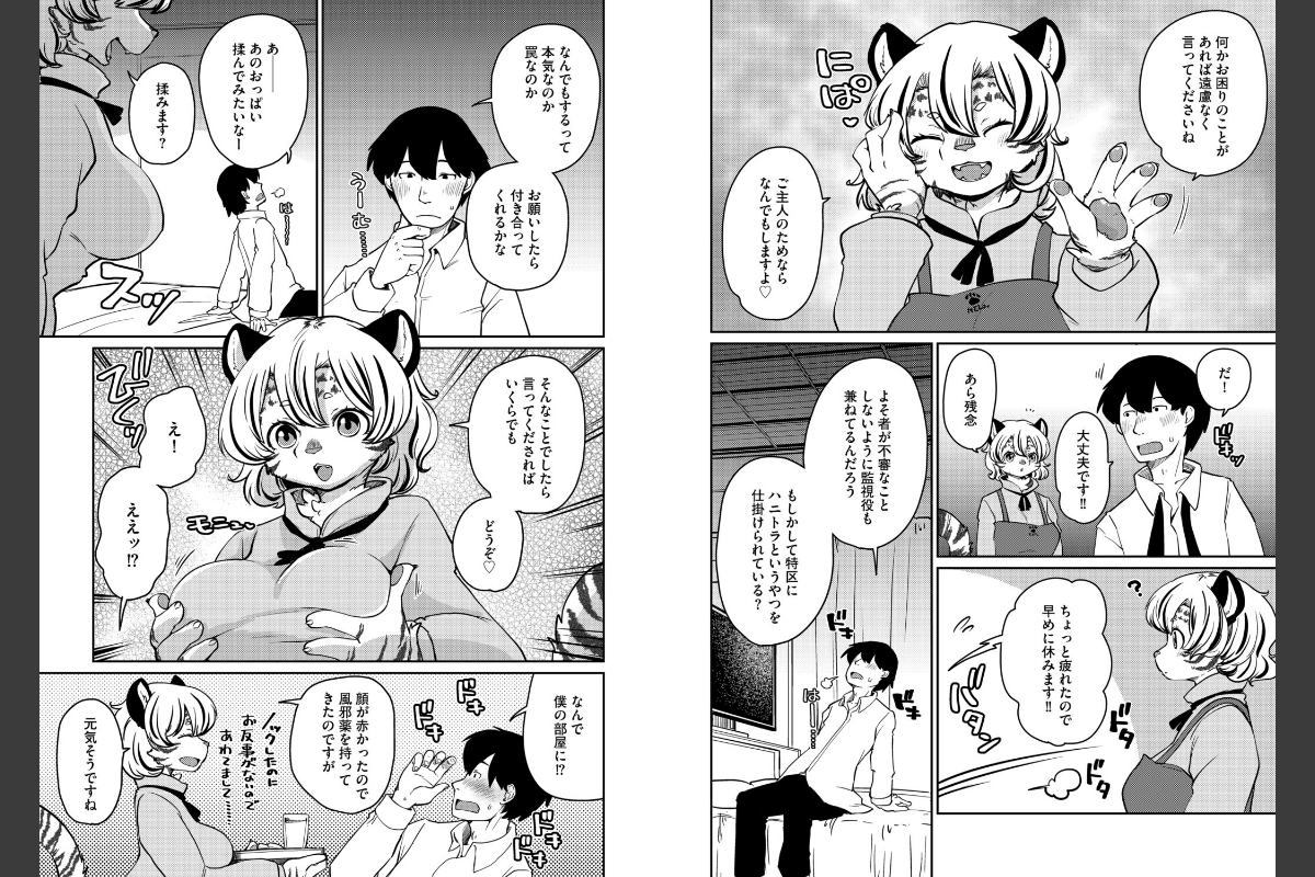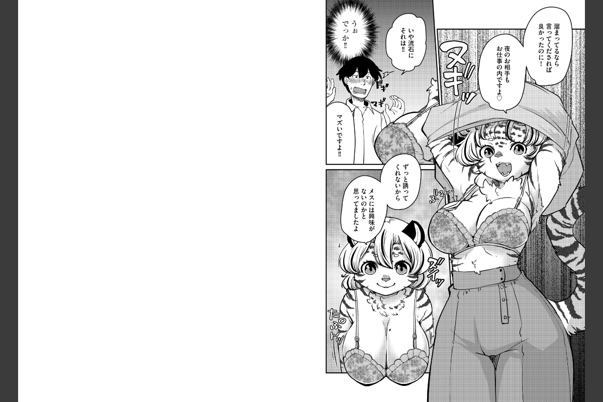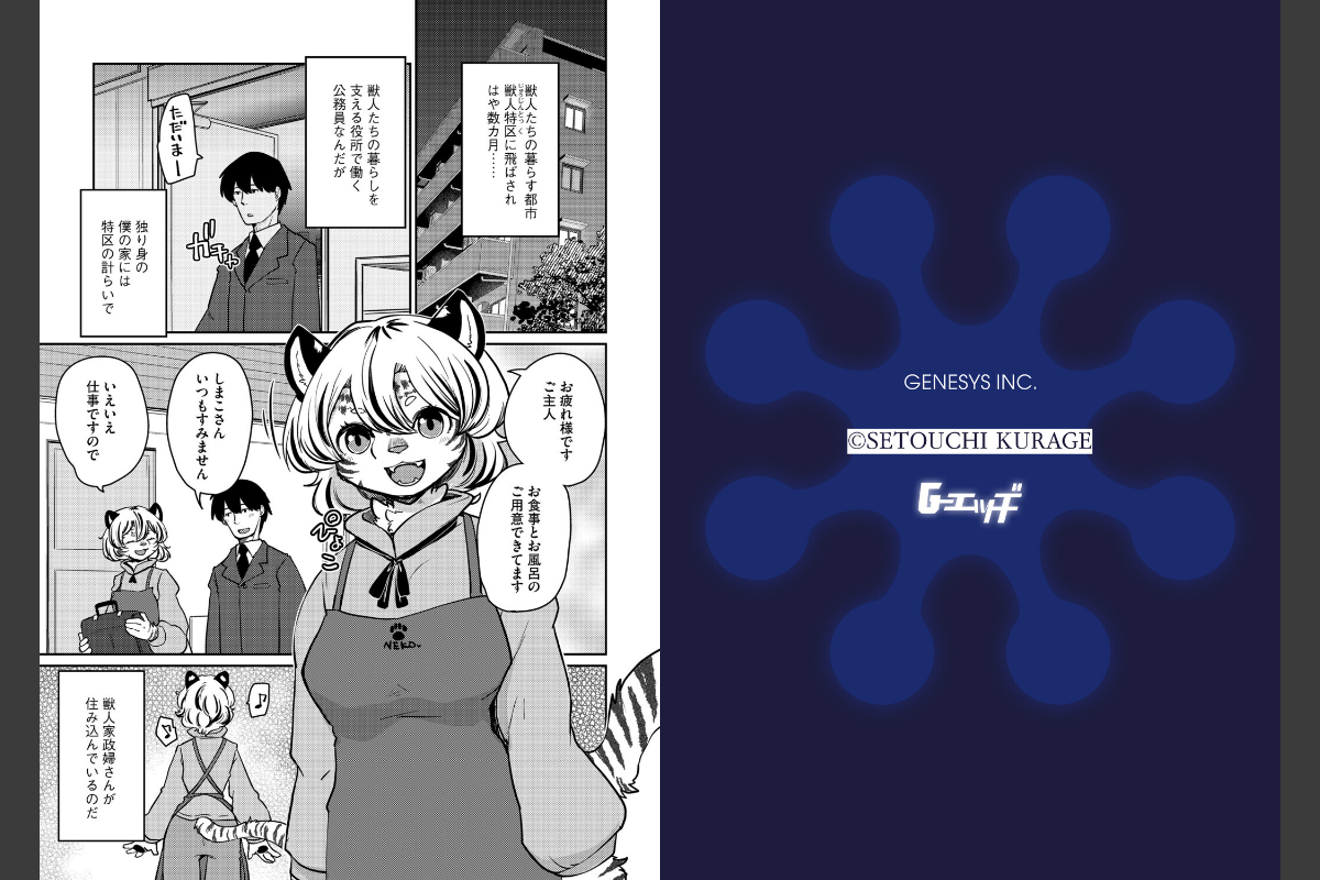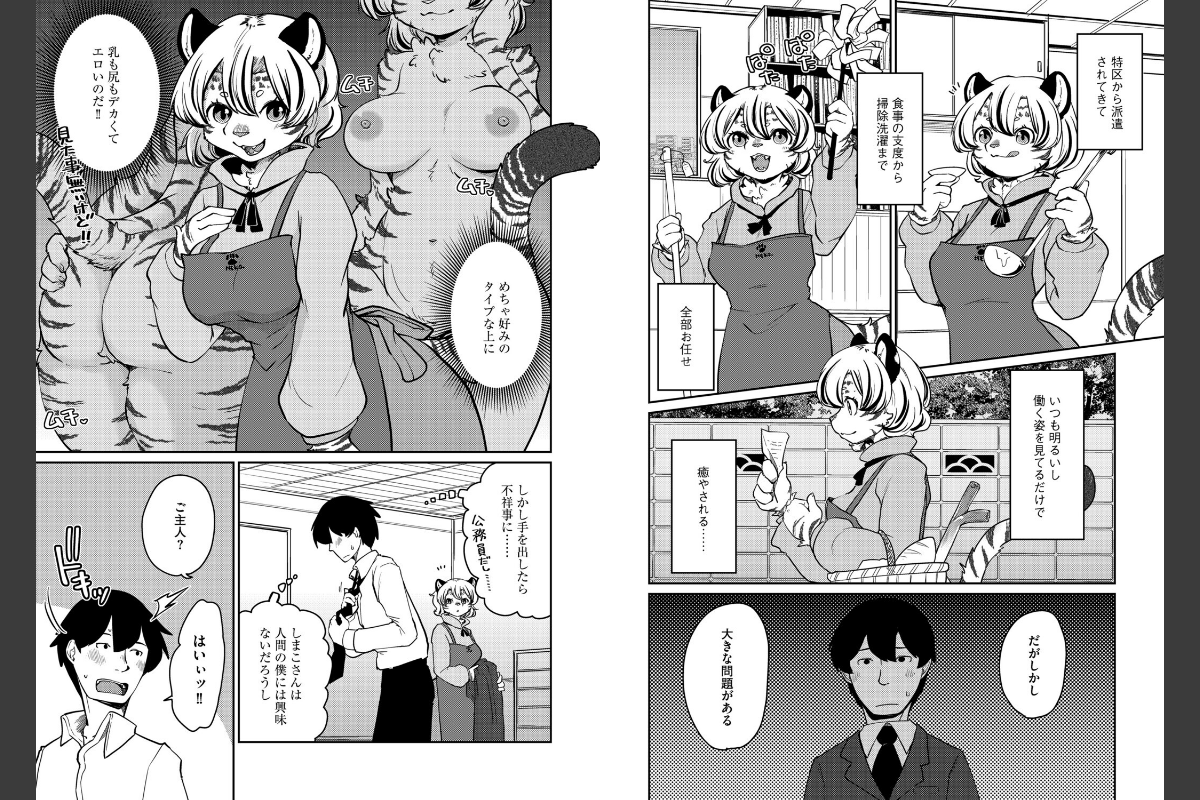 獣人たちの暮らす街、獣人特区。ここに住むことになった人間の僕は公務員として働いている。役所の計らいで獣人家政婦しまこさんが住み込んでいる。のだが、見た目もタイプで乳も尻も大きくエロいことに悩まされていた……。しかし、ひょんなことから夜のお相手も仕事の内とエッチなことをしてもらえる急展開に!!!本当はダメなのに体は勝手にしまこさんのおっぱいに吸い寄せられてしまう……!積極的なしまこさんに抗えない!!!瀬戸内くらげの描く、もふもふケモ美女との濃厚エッチ、ご堪能あれ♪※この作品は『G-エッヂ Vol.071』に収録されています。重複購入にご注意ください。