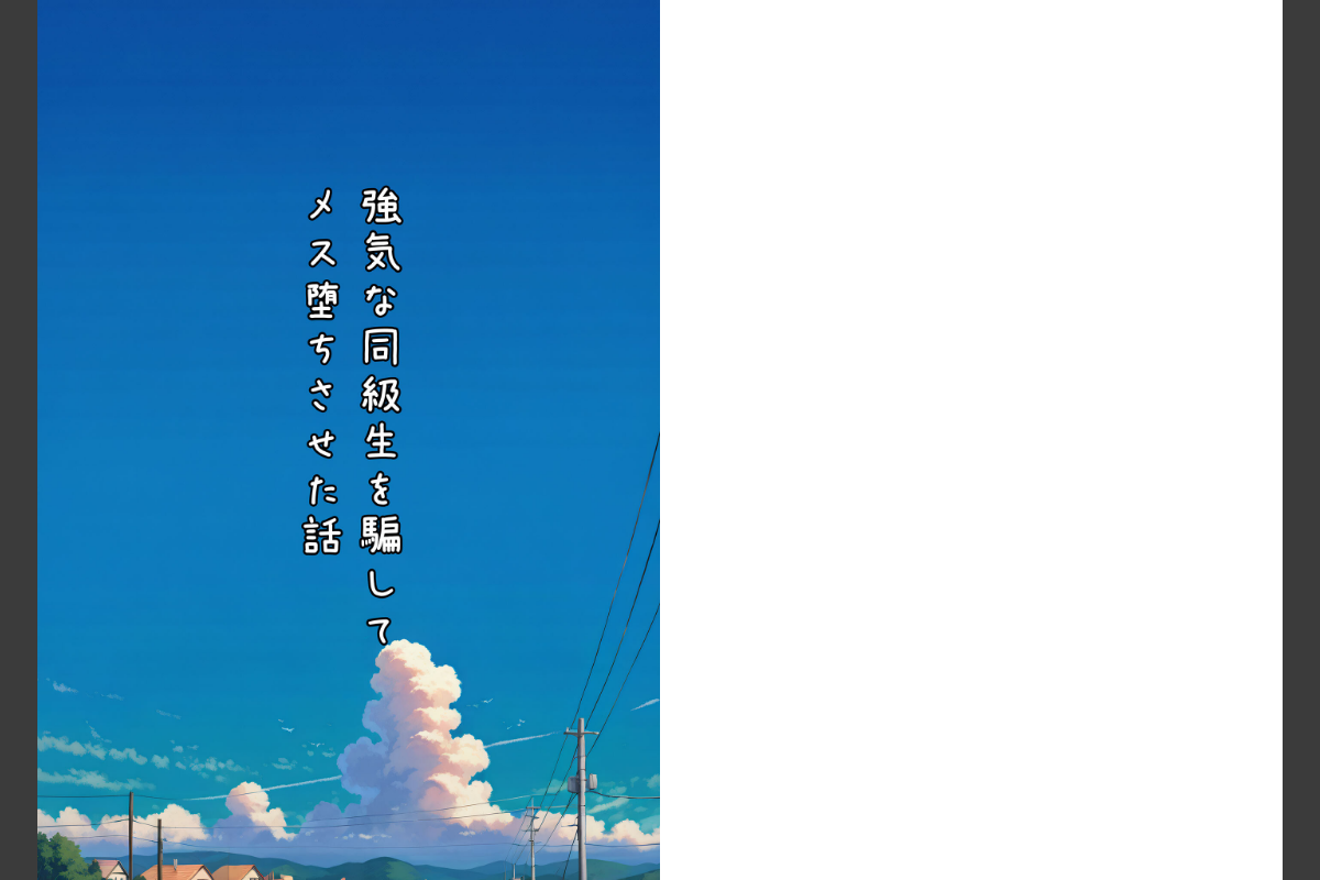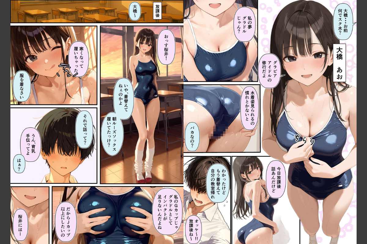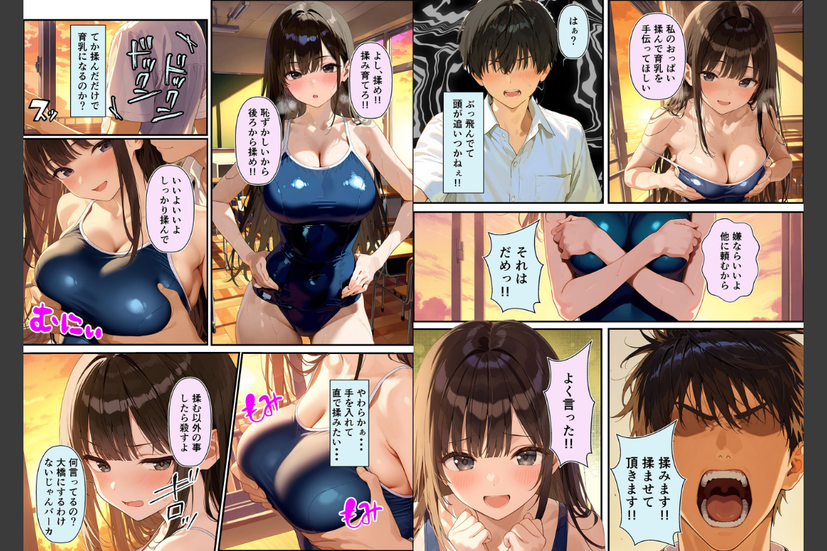 グラドルを目指す大橋は、自分のGカップではインパクトに欠けると悩んでいた。そんなある日、信憑性の怪しいネット記事を読み、「胸を揉まれることでバストアップできる」と信じ込み、同級生の桜井に揉ませることを決意する。揉ませたことでムラムラが止まらなくなった桜井は、ふとあることを思いついた。「ネットリテラシーの低い大橋なら、オチ●ポミルクが育乳に効くって言えば信じるのでは…?」その目論見は的中し、大橋はまんまと信じ込み、育乳のためだと中●しセックスを始めてしまう。しかし、いくら続けても効果が出ず、大橋は次第に焦り始める。その焦りは苛立ちへと変わり、強気な性格に拍車がかかって、桜井に対して激しい説教を繰り返すようになる。ただ挿入して中に出すだけの作業的なセックスと、日常的に続く大橋の説教に嫌気がさした桜井は、彼女を再び騙し、自分の望む「普通の」セックスをさせてメス堕ちさせる方法を企てるのだった――。本編 85ぺージ CG集 230ぺージヒロイン大橋 あお・気が強いが間抜け・桜井とは仲良しだがケンカしがち・表には出さないが、仲良しの桜井のことが実は好き・将来グラドルになりたいがGカップではインパクトに欠けると思い込みJカップぐらい爆乳オッパイにしたい・行動力はあるが、変な情報を信じやすい主人公桜井・気が強い・大橋とは仲良しだがケンカしがち・表には出さないが、仲良しの大橋のことが実は好き・エロ漫画を読んで中●しセックスに憧れを抱いている【注意事項】※本作品に登場する人物は全て人工知能(AI)によって生成されたイラストであり、実在しません。※本作品はAI生成画像のため、手足など細かな部分が乱れている場合があります。※本作品に登場する人物は全員20歳以上です。※犯罪、その他違法行為を美化または助長する意図はございません。※本作品は、原作の本文・画像等を、権利者様から許諾を頂いております。(C)ラビットフット/潮吹きんぐグラドル志望の強気な同級生を騙してメス堕ちさせた話