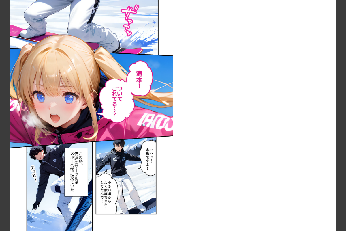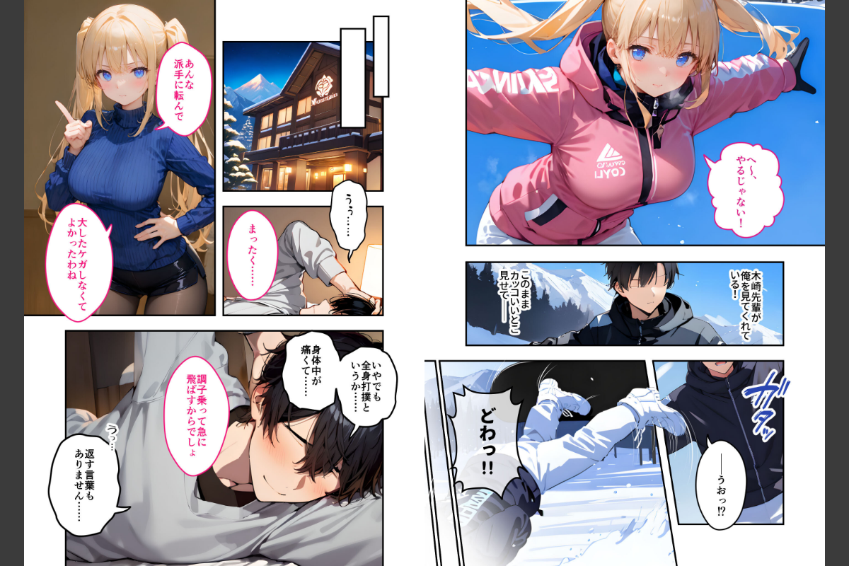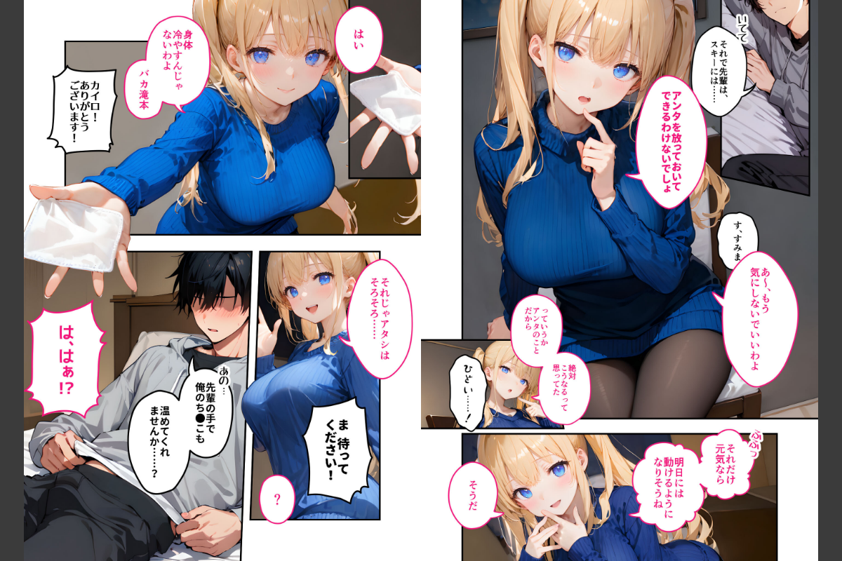あいつは万年補欠の陸上部員・滝本。スキー合宿中に盛大に転んで動けなくなったから、マネージャーのあたしが介抱することになったんだけどなんだか落ち着かない様子。不審に思って問い詰めたら「カイロだけじゃなくて、先輩の手で俺のちんこも温めてくれませんか?」って言われて…はぁ!?「知らないわよ!それこそカイロ当てればいいじゃない!」「先輩の手じゃないとダメなんです!」「それにまだ手が痺れて上手く動かせなくて…」もう…しかたないなぁ…「やればいいんでよ、やれば」「その代わり!」「ちゃんと大人しくしてなさいよね……♪」これもマネージャーの務めなんだから…!本編45P+AIイラスト5P収録!【注意事項】※本作品のシチュエーションは全てフィクションです。登場する人物や設定等は、すべて架空のものとなります。※この作品内に登場するキャラクターは全員20歳以上です。※本作品はAIによる生成画像を使用して制作しております。※犯罪、その他違法行為を美化または助長する意図はございません。