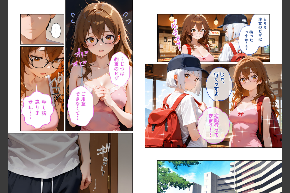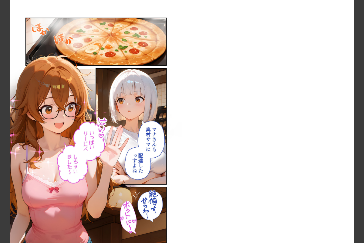 「マナさんも奥村サマに配達したっすよね」「はい♪いっぱいサービスしちゃいました♪」「あれでもわたし前の配達で――」「……どうしましょ〜っミユ先輩…!」「やっちゃいましたぁぁ……」どうやらオマケ用のピザの話を奥村サマは覚えていた様子。「まぁ奥村サマは話せば分かる人っすから」「それじゃあ配達いくっすよ」「おまけのピザはないっすけど、そのかわりこっちでサービスするっす」本編45P+AIイラスト5P収録!【注意事項】※本作品のシチュエーションは全てフィクションです。登場する人物や設定等は、すべて架空のものとなります。※この作品内に登場するキャラクターは全員20歳以上です。※本作品はAIによる生成画像を使用して制作しております。※犯罪、その他違法行為を美化または助長する意図はございません。