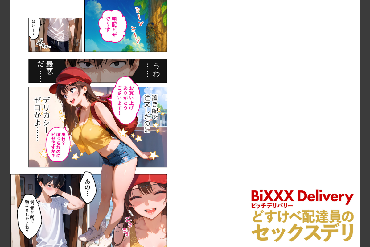 空腹の中、ふと思い出す。「注文ありがとうございます!あれ、ぼっちなのにピザですか?」あぁ…最悪だ……置き配で頼んだのに、こんなにもデリカシーのない配達員が来るなんて。デリカシーがない上にキャンペーンのじゃんけんに負けて文字通りタマを搾り取られてしまった。それからピザ屋内で俺が絶○と噂が広まったらしく……キャンペーンやら特別研修といいながら搾り取ってくる最初の痴女店関係なくヤらせてくれるダウナーな痴女こっちの話を聞かない猪突猛進な痴女……ってあの店は痴女しかいねぇのか!?いい思いしているのは確かだけど、このままだと俺のタマが本当に枯れてしまう……!そんな悩みを遮るようにチャイムが鳴る――「お待たせしましたー!ハッピーピザの特製ミックスピザお届けです!」■収録作品BiXXX Delivery 第1巻 〜どすけべ配達員のセックスデリ〜 モザイク版BiXXX Delivery 第2巻 〜どすけべ配達員のセックスデリ〜 モザイク版BiXXX Delivery 第3巻 〜どすけべ配達員のセックスデリ〜 モザイク版BiXXX Delivery 第4巻 〜どすけべ配達員のセックスデリ〜 モザイク版【注意事項】※本作品のシチュエーションは全てフィクションです。登場する人物や設定等は、すべて架空のものとなります。※この作品内に登場するキャラクターは全員20歳以上です。※本作品はAIによる生成画像を使用して制作しております。※犯罪、その他違法行為を美化または助長する意図はございません。
