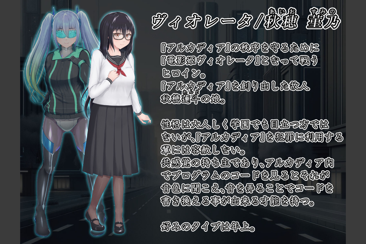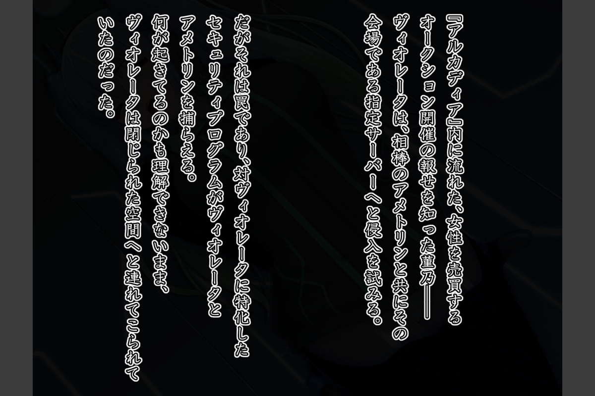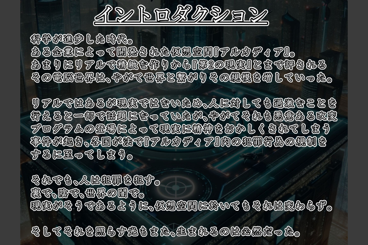 科学が進歩した世界。ある企業が開発した電脳空間『アルカディア』。天才擁する精鋭チームによって作られたそのプログラムはそれまでのVR空間やフルダイブ型のゲームなどと違い、第2の現実と言って差し支えない程にリアルで精緻なものだった。現実(リアル)の質感でありながら、プログラムによってほんの少しの超常現象を体験出来る世界。初めは一都市が舞台であった『アルカディア』は徐々に規模を増し、様々な世界の都市を再現するに至っていた。そんな世界の治安を守るために密かに活動するヒロイン──秋穂菫乃。自身の特異な才能から、大幅な容姿(アバター)の変更は不可能なはずの『アルカディア』で誰もが目を引く姿──『電影姫ヴィオレータ』へと変身した菫乃は相棒(パートナー)であるAI『アメトリン』と共に、日々犯罪者を無力化しては治安当局に連絡して捕縛させていた。ある日、一般には検索できないサーバー──通称『裏ワールド』に、電脳世界で精神をおかしくされ性●●と化した子達のオークション開催の報せがにわかに広がる。冷静でありながらも義憤に燃える菫乃は、保護者兼技術者の紫やアメトリンの協力を得てその会場の座標を特定し、いつものように犯罪者たちを捕まえに行く。それが菫乃──『電影姫ヴィオレータ』を捕らえる為の罠であるとは気づかずに。CG:22+α枚本編:755枚プロローグ:115枚エンディング2パターン:計182枚文章なし差分:381枚※本作品は、原作の本文・画像等を、権利者様から許諾を頂いております。(C)ばたぁさんど/星井工房エイドス・アルカディア-虚映●● 隷従の電影姫-