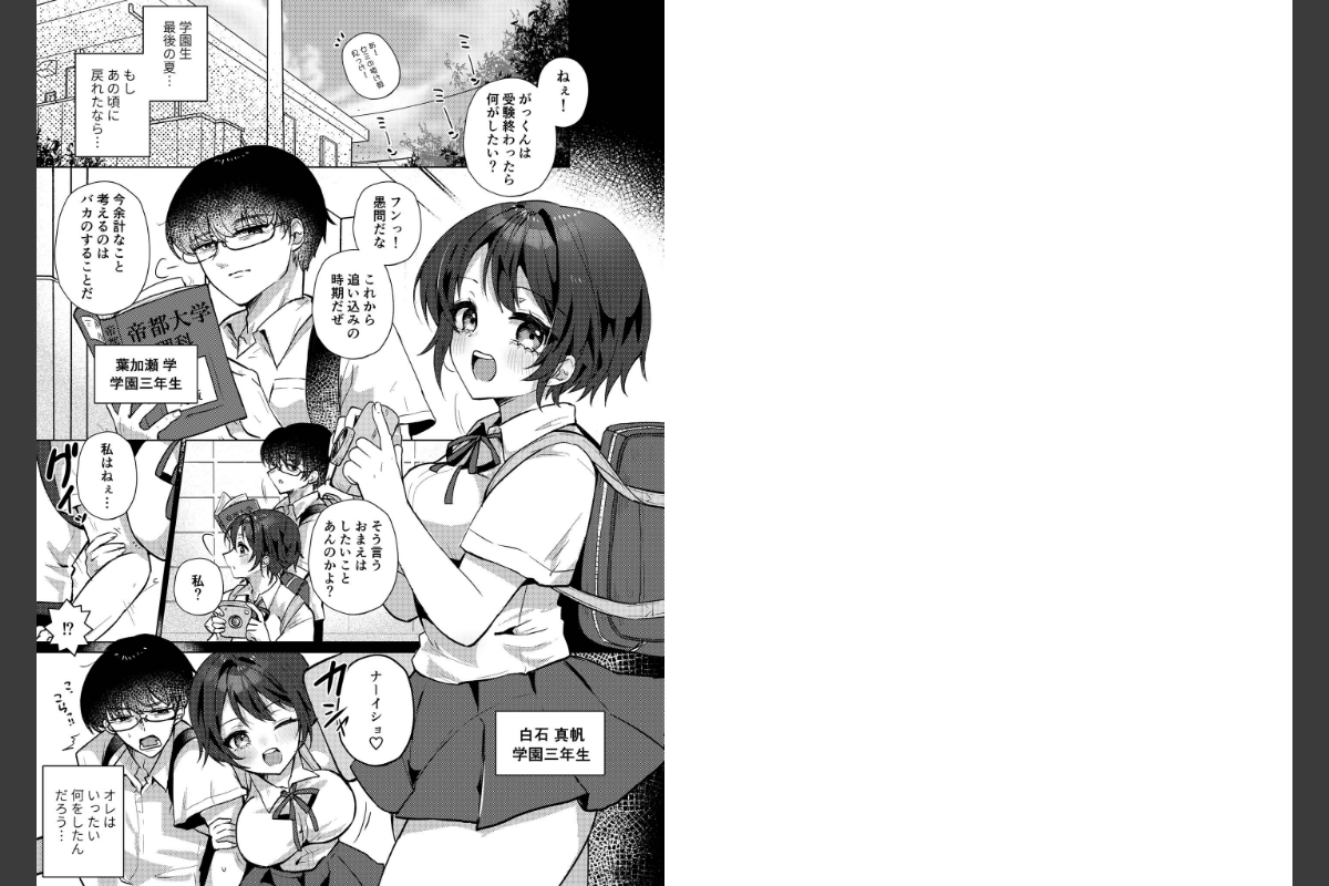 「もしも、もう一度あの夏に戻れたとしたら?」かつては国内最難関・帝都大学への合格も間違いないと言われた、学園イチの秀才・学(がく)。受験失敗をきっかけに家にこもり、暗い自室でゲームに耽る毎日に……。学を置いて帝都大学に合格した幼馴染・真帆(まほ)の名を聞くたびに苛立つそんなある日、彼のもとに一通の奇妙なメールが届く。「合格おめでとう!」「この期に及んで嫌がらせか…」そう吐き捨てた瞬間視界が歪み、目を開けると……。「ちょっと! がっくんってばぁ!」目の前にはあの頃の真帆がいた!うれしさと混乱が同時に押し寄せる中、真帆のかわいさとエロさに気づいてしまった学。あふれるリビドーは、もう止まらない!甘々えっちなヤリ直しストーリー第三弾!原作:ピュリフレクト編集部 構成:音無響介 作画:ゆりも